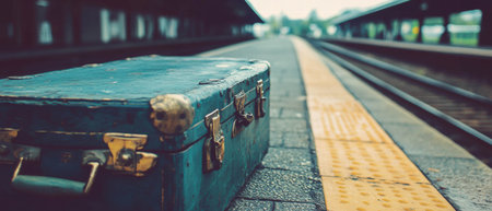 Vintage trunk rests at deserted train station in cinematic hyper-realistic setting