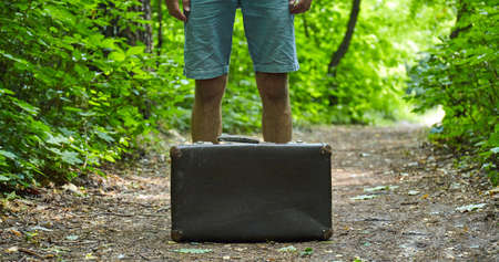 Old suitcase on the beach. Retro style toned picture. Travel concept