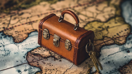 Capture the essence of adventure with this vintage leather suitcase featuring a key, set against a detailed nautical map that inspires travel dreams.