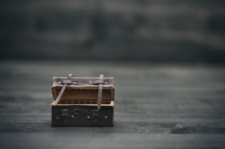 An antique treasure chest sits on a weathered wooden surface, illuminated by warm lighting. The chest, featuring metal accents and a secure lock, is the central focus. The composition includes a blurred background of soft, out-of-focus lights. This image is suitable for various commercial purposes, including historical themes or design elements.