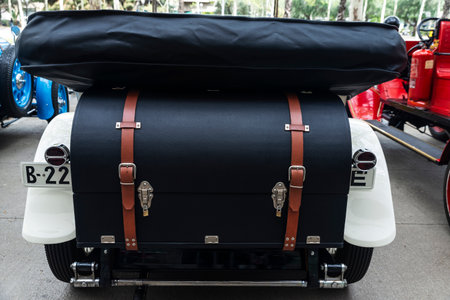 Suitcase in the back of an old retro car from the 1920s parked on a street in Barcelona, Catalonia, Spain