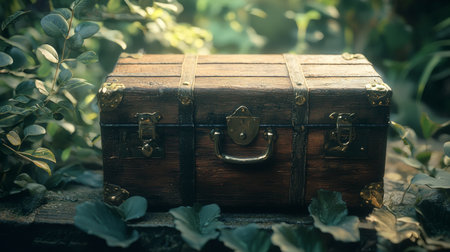 A vintage wooden chest with brass details placed amidst lush greenery, creating a rustic and mysterious atmosphere, perfect for storytelling or treasure concepts.