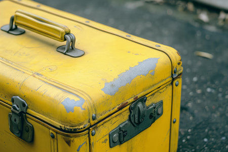 Close-up of an old yellow suitcase with peeling paint, symbolizing travel
