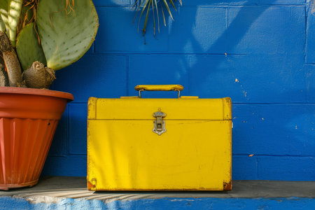 Vibrant yellow old-fashioned suitcase stands out against a bold blue textured wall, with plants nearby