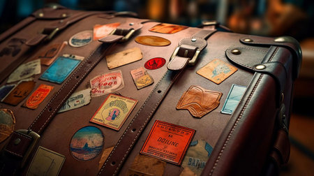 Vintage suitcase covered with stickers from various countries, representing love for travel and collecting memories.
