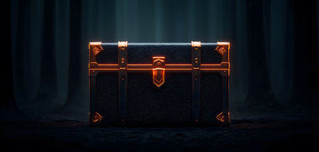 A striking treasure chest featuring ornate golden accents rests amid dim shadows, evoking mystery and intrigue. The chest's design captivates the viewer's attention.