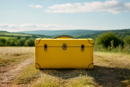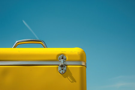 Travel in style with a vibrant yellow suitcase under the clear blue sky background