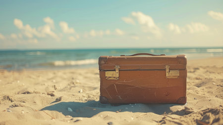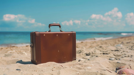 Modern brown suitcase in the sand, in front of a beach generative ai