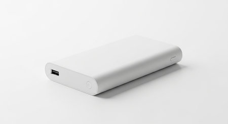 A sleek white power bank isolated against a clean. white background. This image is perfect for showcasing your power bank product or illustrating the convenience of charging on the go.