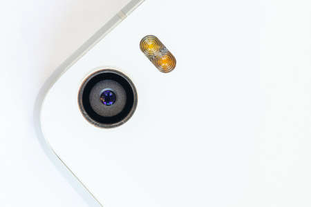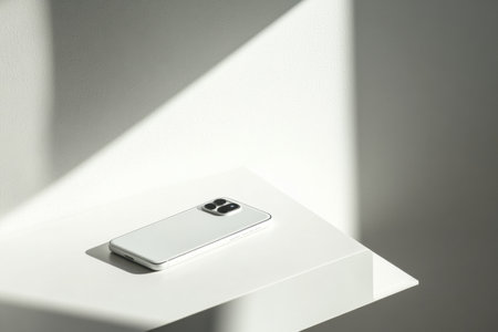 A modern smartphone rests on a smooth white surface, illuminated by soft diffused lighting, highlighting its sleek design and minimalist aesthetics.