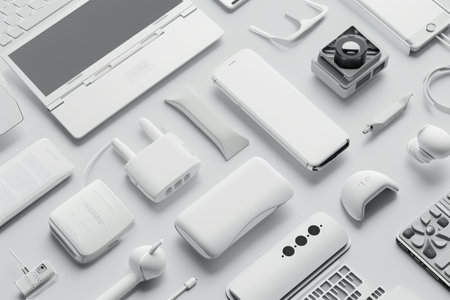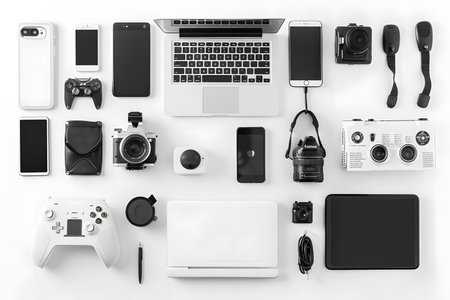 A modern flat lay featuring various technology gadgets and accessories arranged on a minimalist desk surface, showcasing a creative workspace aesthetic ideal for digital product photography.