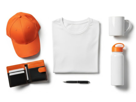 This image features a collection of office supplies isolated on a white background. The items include an orange baseball cap, a white t-shirt, a white mug, a black pen, a wallet, and a white water bottle with an orange lid. The items are neatly arranged, providing a clear view of each object.
