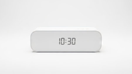 A close-up photograph displays a rectangular, white digital clock against a clean white backdrop. The clock's display shows the time as 10:30. The composition features a minimalist style with even lighting and highlights the modern design suitable for various uses.