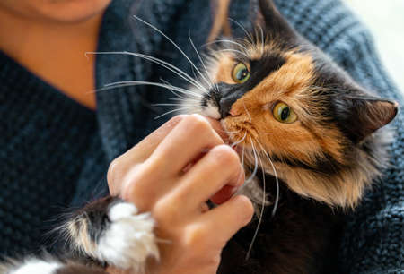 Charming three-color young cat playing with hand of her mistress. Selective focus on cat muzzle.
