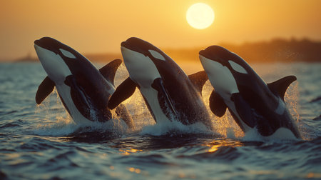 A pod of orcas leaps from the ocean against a stunning sunset, displaying their grace and power.