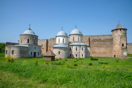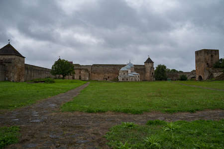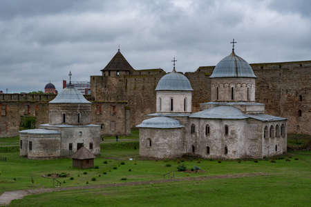 Courtyard of Ivangorod Fortress. View to churches of Saint Nicholas and Dormition of the Mother of God, walls and towers. Ivangorod, Russia