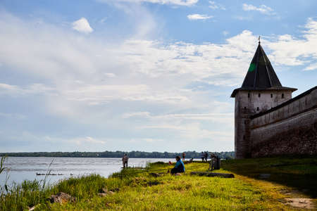 Kirillov, Russia - June 18, 2019: Fisherman people on the lake shore on a summer day near the Kirillo-Belozersky monastery