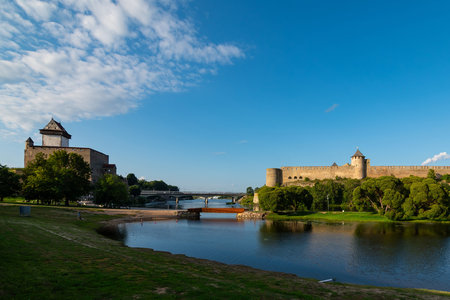 Narva fortress on the border of Estonia and Russia, unique view - the border of Europe and Asia, the border of European Union and Russian Federation, fortresses on the bank of the river Narova.