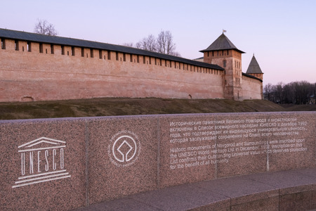 VELIKY NOVGOROD, RUSSIA - APRIL, 2019: Sign UNESCO near the Kremlin walls in Novgorod the Great (Veliky Novgorod), Russia