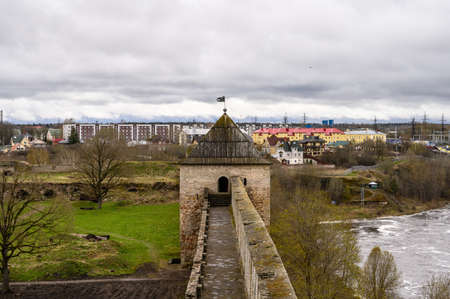 Ivangorod Fortress in the old town, old stone landmark, fortification building landscape, Russia