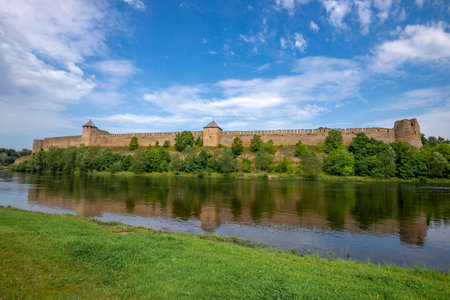 russian fortress of Ivangorod with river in foreground and blue cloudy sky in background
