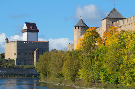 Sunny autumn day on the river Narva. Views of Herman's castle (Estonia) and Ivangorod fortress (Russia)