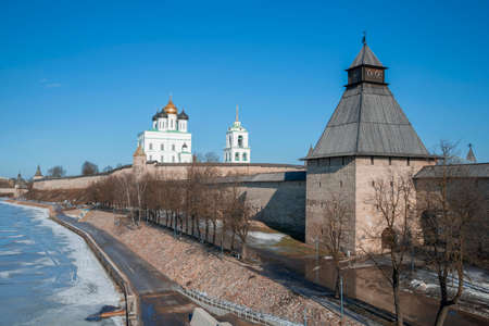 Ancient Pskov Kremlin on a sunny March day. Pskov, Russia