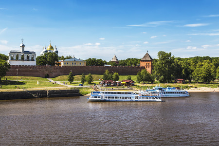 View of the Kremlin and the promenade with a pier for tourist boats. Veliky Novgorod, Russia