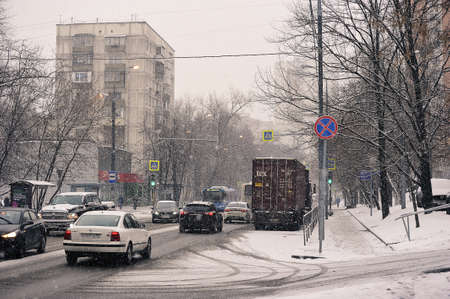 MOSCOW, RUSSIA - December 5, 2021: Snowfall on Moscow streets - 15 Parkovaya Street