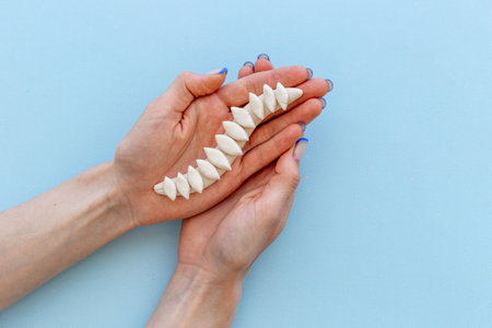 Prosthetic dentistry White teeth on blue background Oral dental hygiene Dental health concept Oral care teeth restoration