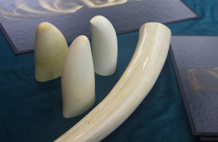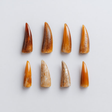 A close-up of unique animal teeth arranged in a neat display. The varying shapes and textures offer educational value and aesthetic appeal for decor.