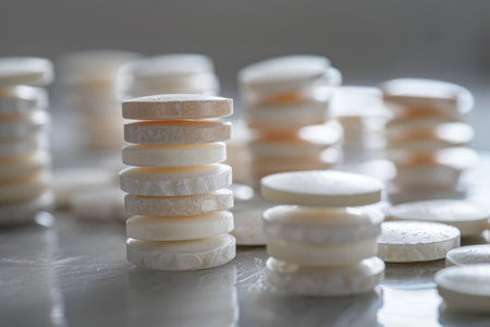 A stack of white pills is on a table. The pills are white and stacked on top of each other