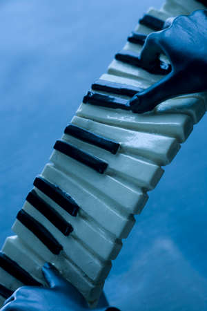 Piano keys on a wooden piano. Close-up. Selective focus.