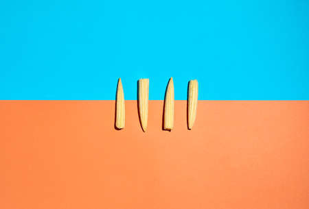 Graphic top view of baby corn on vibrant blue and pink background, healthy eating and vegan concept, copy space