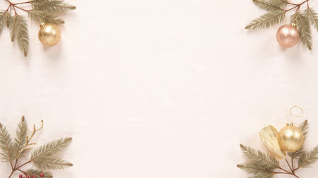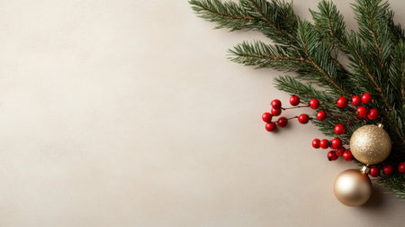 A serene composition featuring a pine branch adorned with red berries and golden ornaments on a soft neutral background, perfect for holiday themes.
