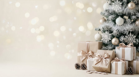 Christmas Tree with Snowflakes and Wrapped Gifts in Soft Bokeh Light
