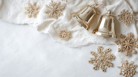 This image showcases an elegant arrangement featuring golden bells, intricate snowflakes, and soft white fabric, ideal for inspiring festive decoration and holiday celebrations.