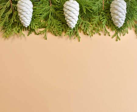 Creative layout made of pine branches and cones on beige background. Flat lay, top view, copy space