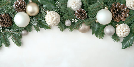 AI Generated. Winter Holiday Decorations Featuring White Ornaments and Frosted Pine Needles on a Textured Background Ready for Festive Celebrations