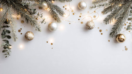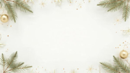 Green pine branches decorated with gold spheres and silver sparkles lining the left and right edges of a white center.