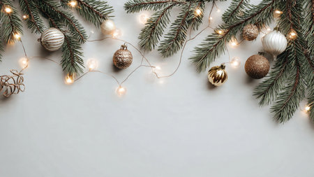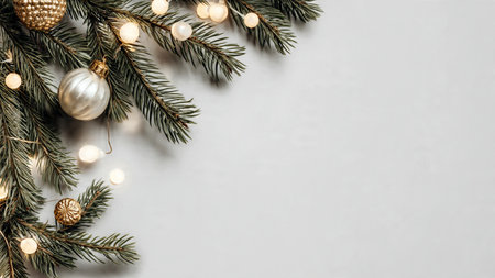 Modern holiday backdrop with pine branches and minimal ornaments.