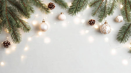 Clean white Christmas background with pine branches, soft ornaments, and gentle fairy lighting.