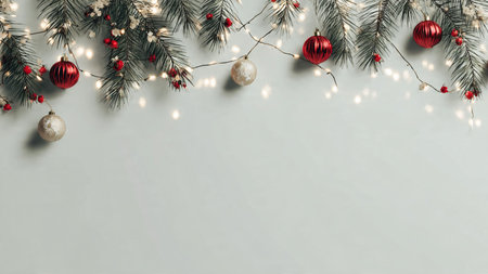 Simple Christmas background design with pine branches, ornaments, and empty space for text.