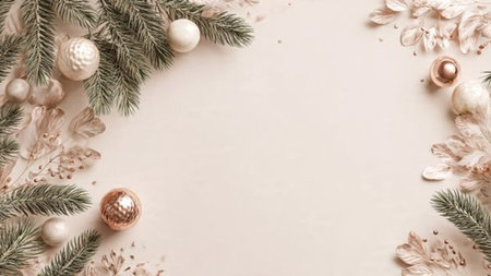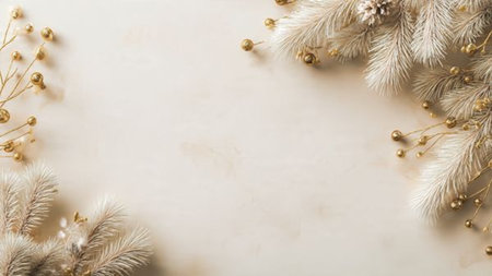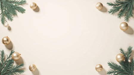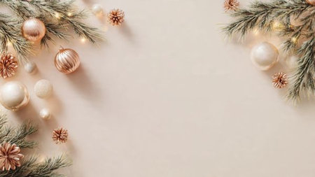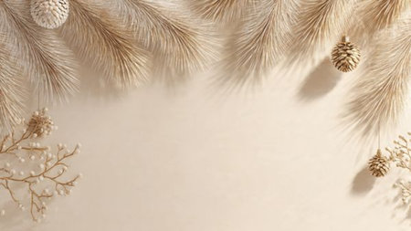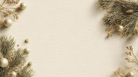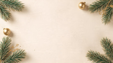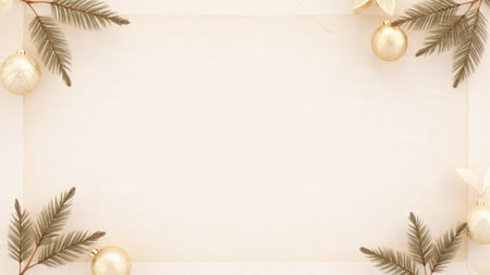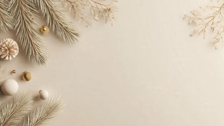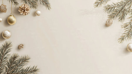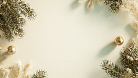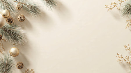 A clean minimalist Christmas background featuring soft beige and ivory tones, pine branches, subtle gold ornaments, and spacious copy space with premium natural lighting.