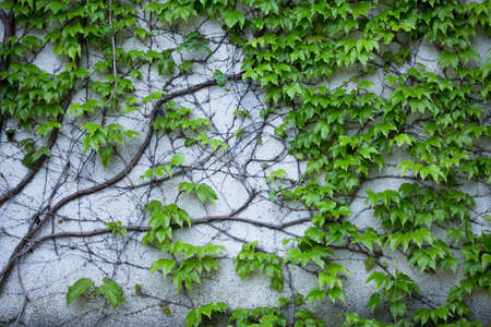 close up of Virginia creeper with young small leaves and growing branches on a plastered wall of a traditional French house.