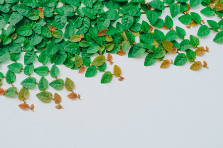 Green ivy leaves on white wall background with shadow. Nature background