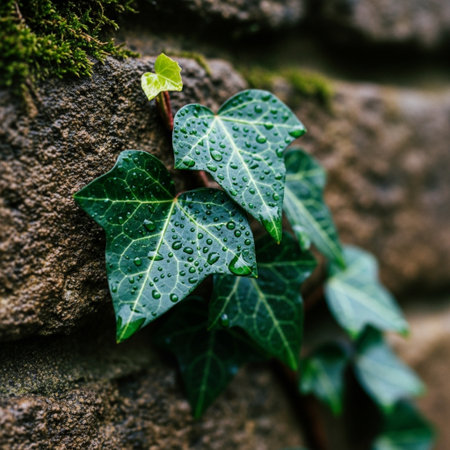 Vibrant green vines climb and cascade around a textured wall, creating a natural border in a serene outdoor space, showing the beauty of nature and plant life.