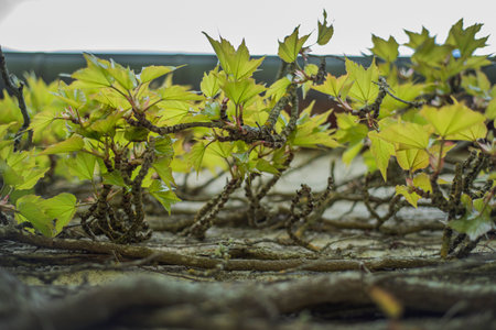 Green leaves on a stone wall. Natural background. Selective focus.