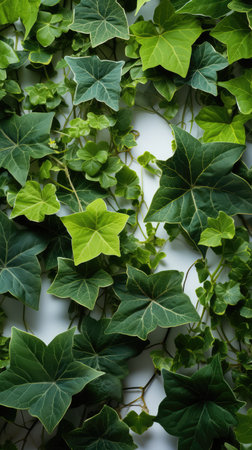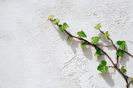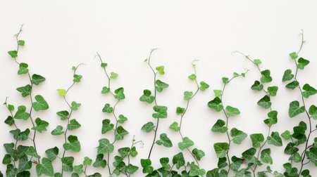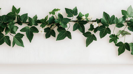Delicate ivy vine gracefully intertwines against a white plaster surface, capturing the essence of nature and simplicity. The lush green leaves contrast beautifully with the muted background.