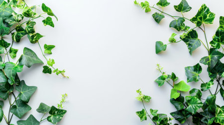 A flat lay image featuring two green ivy vines with variegated leaves framing a white background. The vines are placed in opposite corners of the image, creating a natural border. The white background provides a clean and minimalist backdrop for the vines.